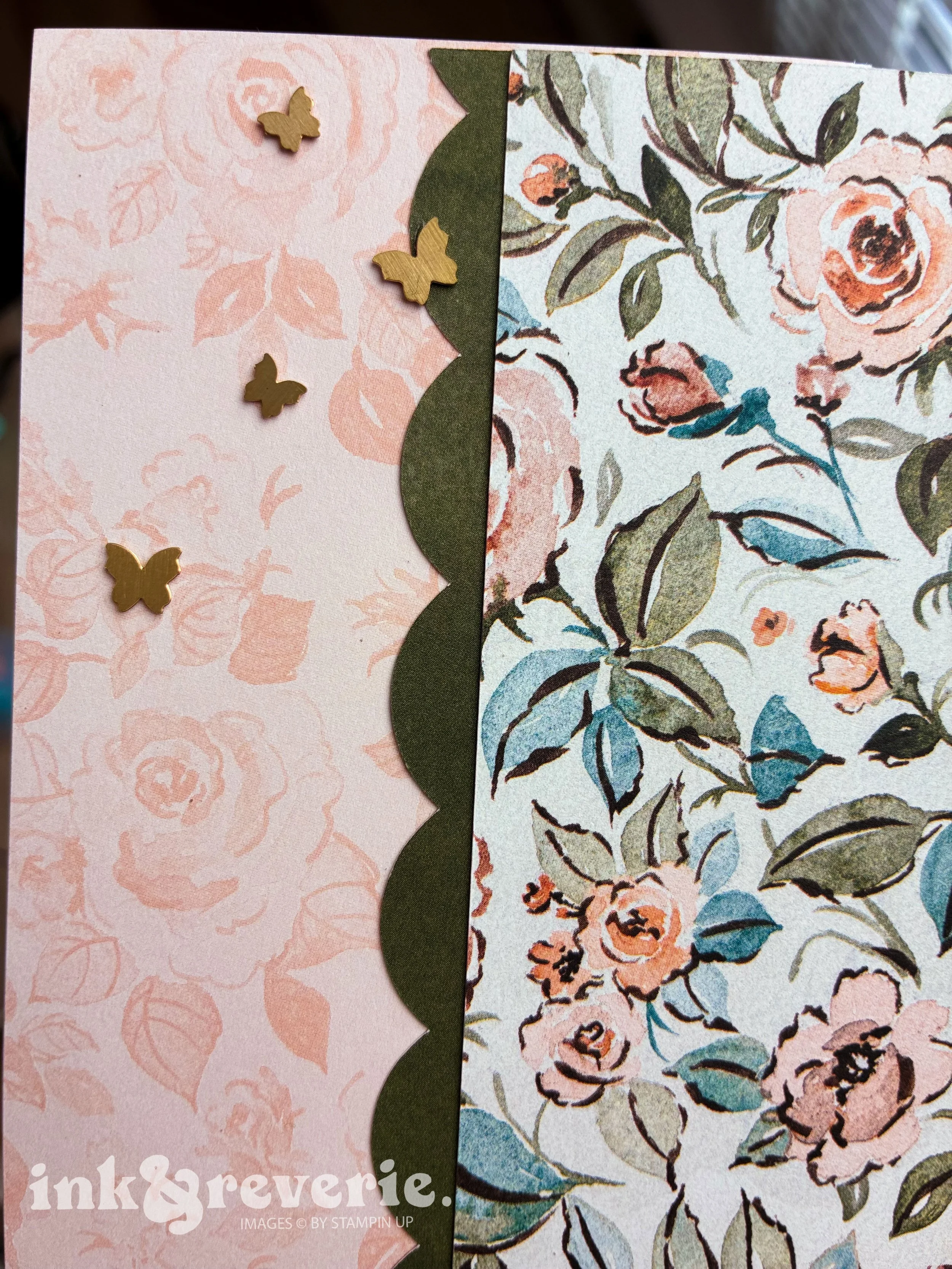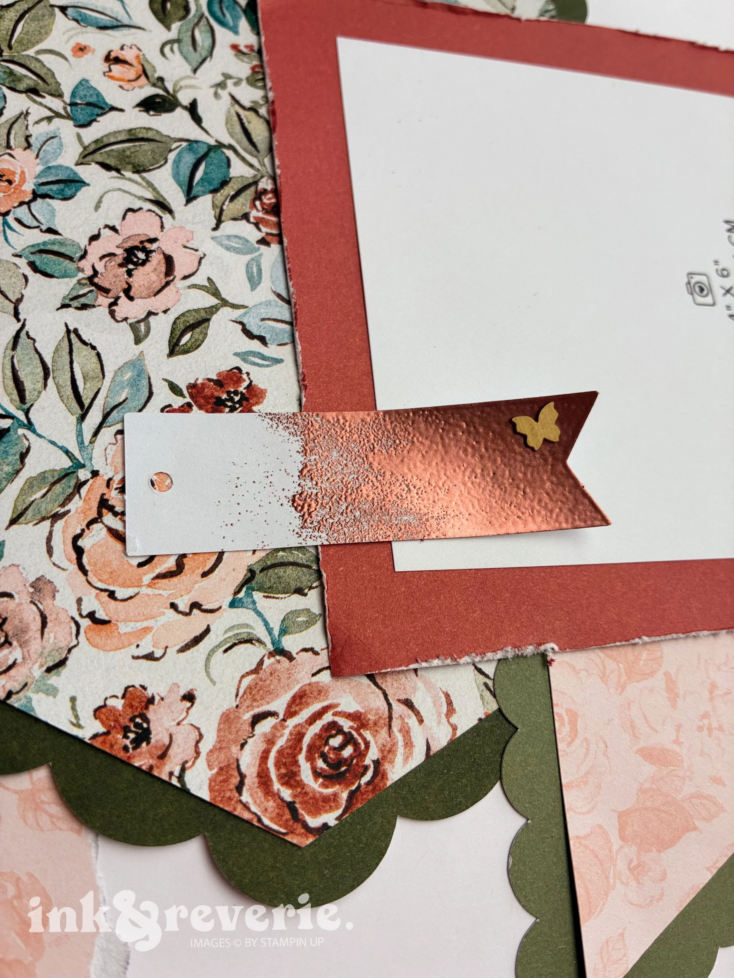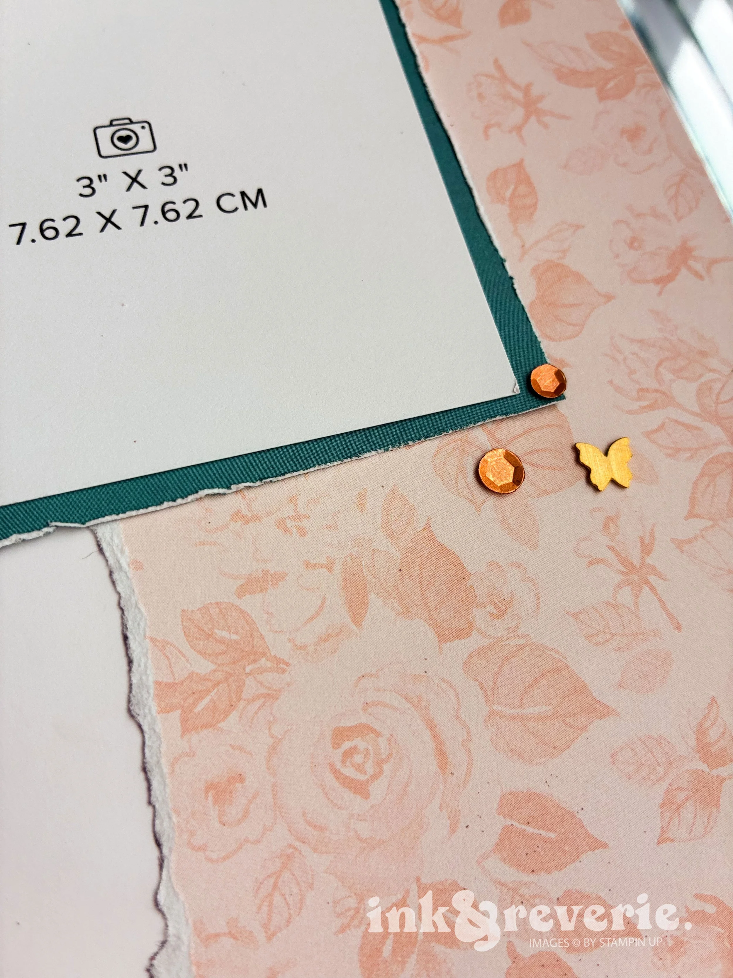 To add some interest and embellishment to the page, I brought in some metallic elements like these super cute copper sequins, gold butterflies, and embossed some areas with copper embossing powder too.